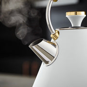 Brand New Tower Cavaletto 1.7L 3KW Pyramid Kettle, 4 Slice 1600W Toaster, Bread Bin, Tea, Coffee & Sugar Canisters. Contemporary Matching Kitchen Set of 6 in Optic White & Champagne Gold Fast Dispatch & Free Next Working Day Delivery from UK Stock. Full 3 Year Tower Manufacturer Guarantee Cavaletto 3KW 1.7L Pyramid Kettle Optic White with Brushed Champagne Accents Add contemporary style to your kitchen with this elegant Cavaletto Pyramid Kettle from Tower. It features a matte Optic White finish with lustrous champagne accents, making this kettle an eye-catching addition to any countertop. Full of modern functionality, it's powered by rapid boil technology to reduce your wait for a delicious hot drink, boiling 1 cup in less than 45 seconds. A large 1.7L capacity lets you make up to 7 drinks from a single fill, ideal for families and busy households alike. With a detachable filter, you can easily remove and rinse away limescale to keep your coffee and tea tasting its best. The perfect pour spout protects against boiling hot water spillages, while the 360-degree swivel base and fully removable lid make it simple to lift and refill the kettle no matter whether you're left or right-handed.