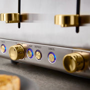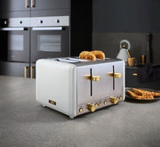 Cavaletto 4 Slice Toaster in Optic White with Brushed Champagne Accents Serve up to four slices of freshly-toasted bread, crumpets or bagels with the Tower Cavaletto 4-slice toaster. With variable browning settings, you have more control over the toasting time to get the texture and taste which suits you best. The defrost, reheat and cancel options offer more functions, allowing you lightly warm up snacks or toast bread straight from frozen for a quick breakfast solution. The removable tray makes it easy to dispose of excess crumbs to keep your countertop clean, with cord storage to keep your surface neat and free from wires. Finished in stainless steel with optical white and champagne colouring, the Cavaletto toaster complements the look of your kitchen countertop.