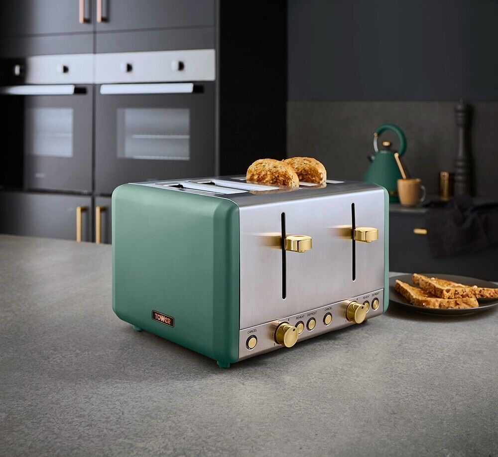 Brand New Tower Cavaletto 1.7L 3KW Pyramid Kettle, 4 Slice 1600W Toaster, Bread Bin & Tea, Coffee & Sugar Canisters. Contemporary Matching Kitchen Set of 6 in Jade & Champagne Gold Fast Dispatch & Free Next Working Day Delivery from UK Stock. Full 3 Year Tower Manufacturer Guarantee Cavaletto 3KW 1.7L Pyramid Kettle Jade with Brushed Champagne Accents Add contemporary style to your kitchen with this elegant Cavaletto Pyramid Kettle from Tower. It features a matte jade finish with lustrous champagne accents, making this kettle an eye-catching addition to any countertop. Full of modern functionality, it's powered by rapid boil technology to reduce your wait for a delicious hot drink, boiling 1 cup in less than 45 seconds. A large 1.7L capacity lets you make up to 7 drinks from a single fill, ideal for families and busy households alike. With a detachable filter, you can easily remove and rinse away limescale to keep your coffee and tea tasting its best. The perfect pour spout protects against boiling hot water spillages, while the 360-degree swivel base and fully-removable lid make it simple to lift and refill the kettle no matter whether you're left or right-handed. · Powerful 3KW rapid boil · 1.7L capacity makes up to 7 cups from one fill · Stainless steel housing · Stylish brushed champagne gold accents · Detachable filter · Pull up lid · Boil dry protection / Automatic switch off · On / off switch with blue indicator light · Item dimensions: H29.1cm x W23.4cm x D21.1cm · Packaging Type: Full colour gift box Cavaletto 4 Slice Toaster in Jade with Brushed Champagne Accents Serve up to four slices of freshly-toasted bread, crumpets or bagels with the Tower Cavaletto 4-slice toaster. With variable browning settings, you have more control over the toasting time to get the texture and taste which suits you best. The defrost, reheat and cancel options offer more functions, allowing you lightly warm up snacks or toast bread straight from frozen for a quick breakfast solution. The removable tray makes it easy to dispose of excess crumbs to keep your countertop clean, with cord storage to keep your surface neat and free from wires. Finished in stainless steel with Jade and champagne colouring, the Cavaletto toaster complements the look of your kitchen countertop. · 1800W 4 Slice Toaster · Stainless steel housing · Brushed champagne gold accents · Enjoy your toast as you like it with variable browning control · Removable crumb tray · Defrost / Reheat and Cancel buttons · Cord storage to help keep your worktop tidy · Indicator light for low light settings · Item dimensions: H26.5cm x W29.00cm x D18.50cm · Packaging Type: Full colour box