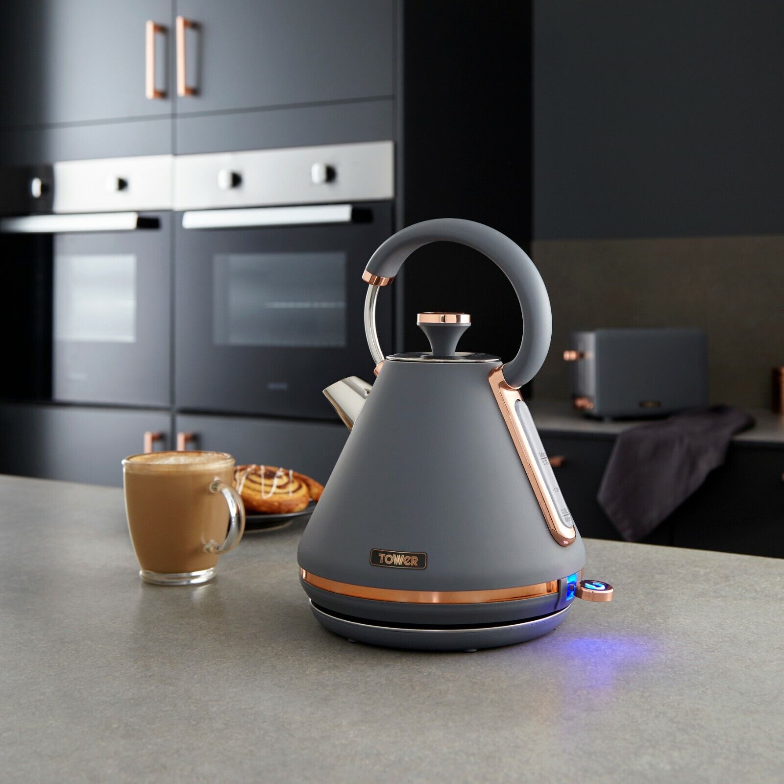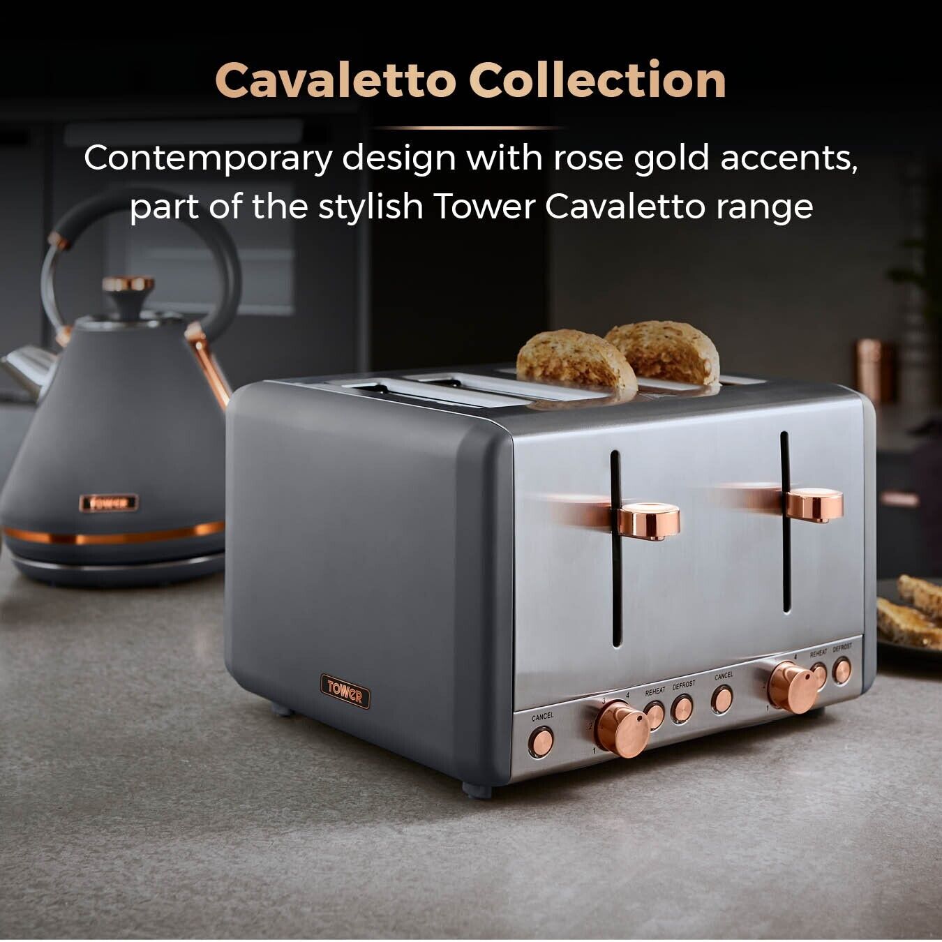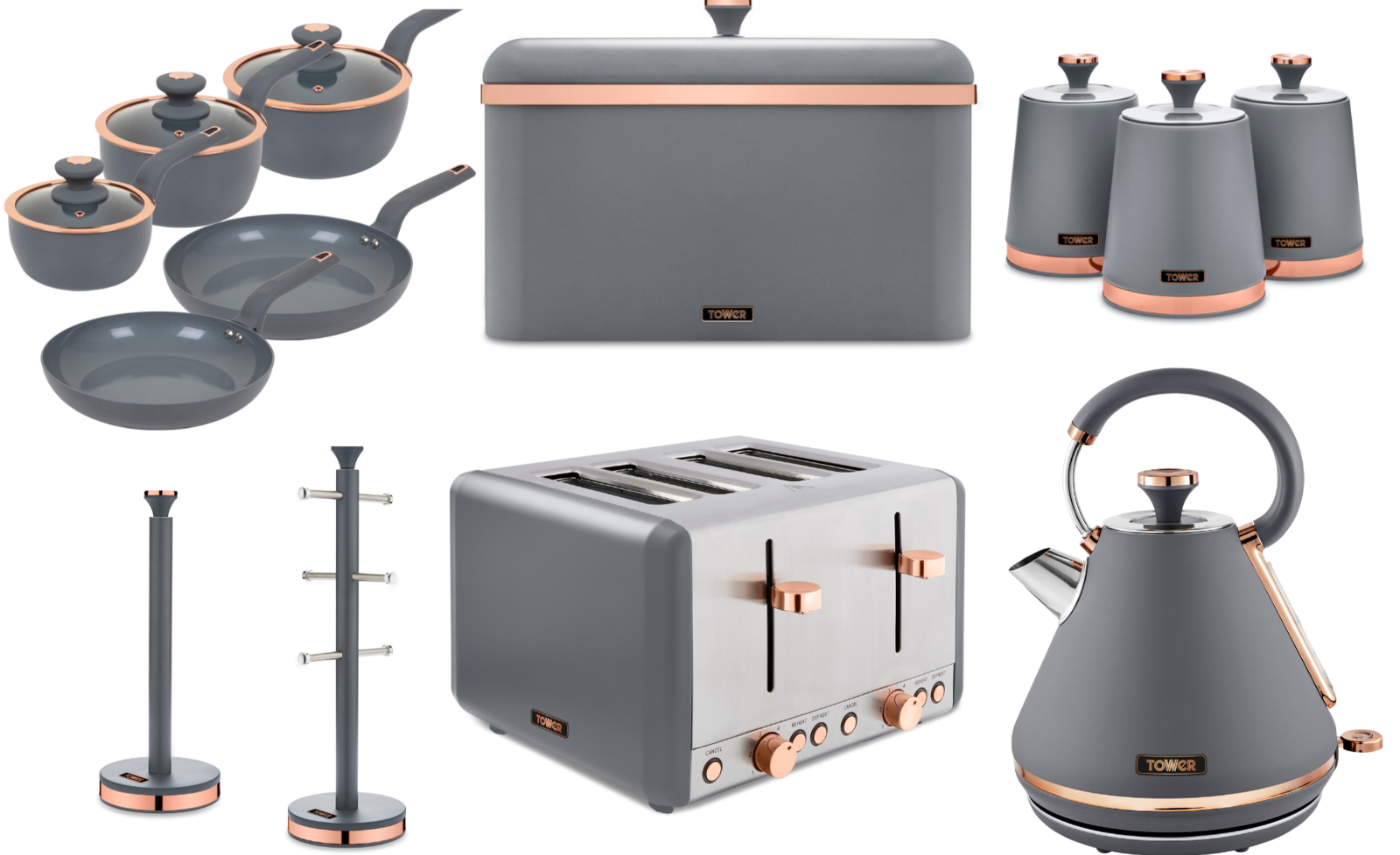 Tower Cavaletto Grey & Rose Gold Pyramid Kettle, 4 Slice Toaster, 5 Piece Pan Set, Breadbin, Canisters, Mug Tree & Towel Pole Matching Set