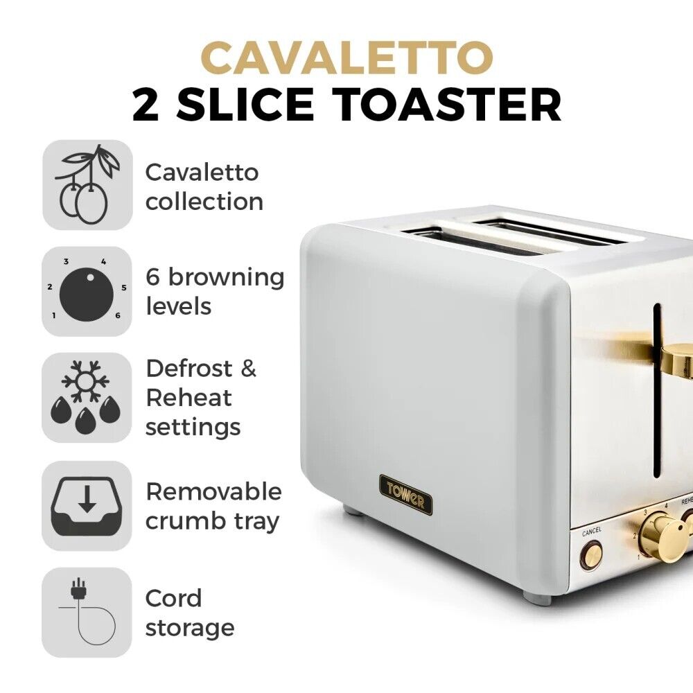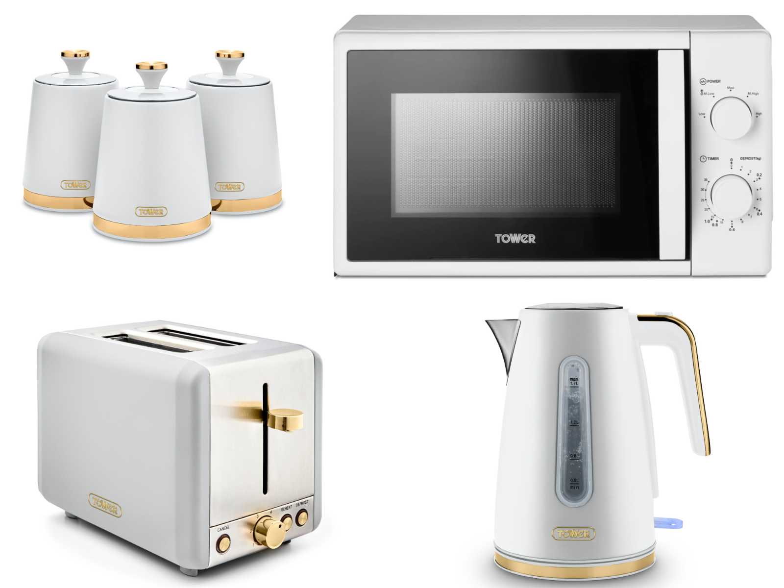 Brand New Tower Cavaletto 1.7L 3KW Jug Kettle, 2 Slice Toaster, 700W 20L Microwave & Tea, Coffee & Sugar Canisters. Contemporary Matching Kitchen Set of 6 in Optic White & Champagne Gold