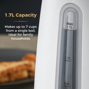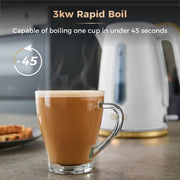 This Tower Cavaletto jug kettle is the perfect addition to today's modern kitchen. The 3kW of power provides rapid boiling, so you can boil one cup of tea, coffee or hot chocolate in less than 45 seconds. Featuring a flip top lid and large 1.7 litre capacity, up to 7 cups can be made at once on a single boil, making it perfect for playing host to family and friends. This kettle is presented in matte optic white with signature champagne accents, providing a subtle yet eye-catching addition to your modern kitchen decor. A detachable limescale filter is also included; making it easier to wash away the excess limescale ensuring your kettle is performing at its best. The boil dry protection and auto shut-off functions offer peace of mind. Includes a 360 swivel base for left and right-handed use and a large viewing window so you know when it is time to refill.