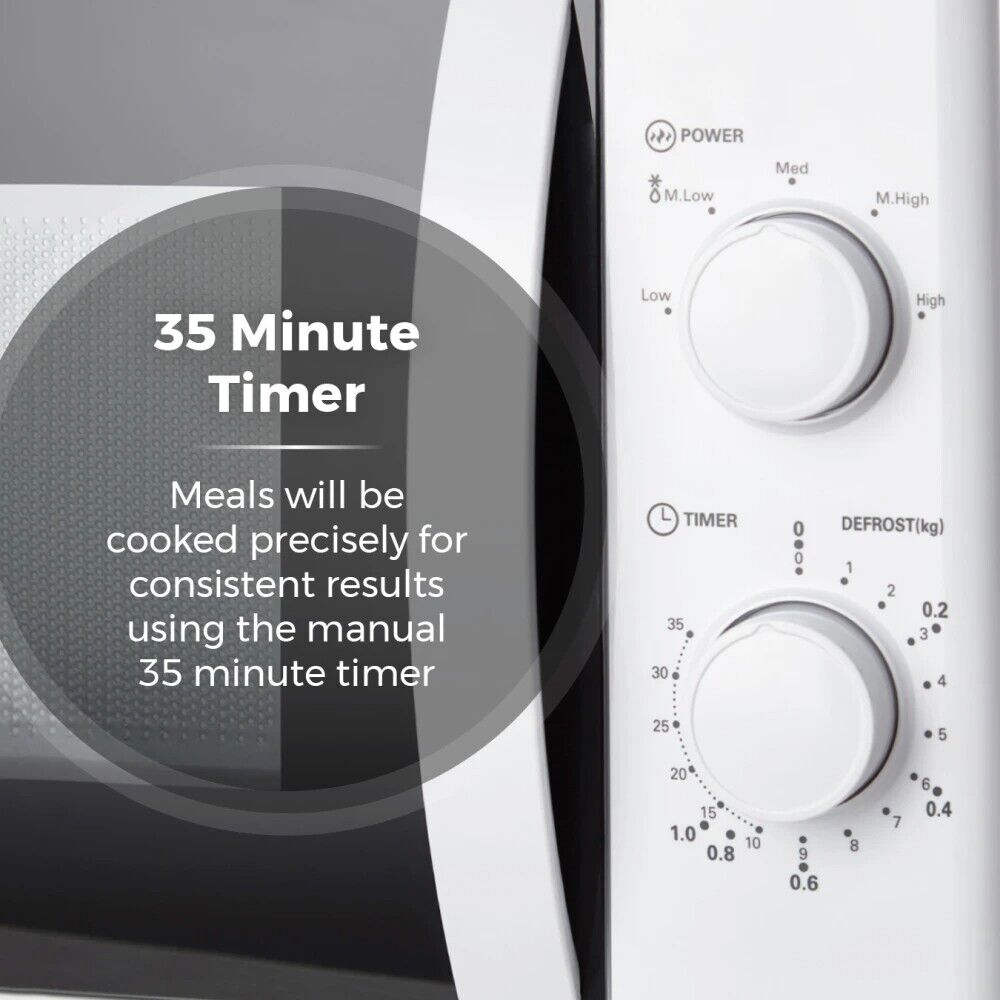 Bring quick and convenient cooking to your kitchen with this 20 litre manual microwave from Tower. The 700W output will rapidly heat meals in a matter of minutes, featuring 5 different power levels to suit a wide range of dishes, including soup, pizza, ready meals and fish. There is also a defrost function, which allows you to cook a meals straight from frozen, perfect for those evenings when you need a quick bite to eat. This microwave features a 35-minute timer that helps ensure your food is cooked accurately for the best tasting results. It has been designed to ensure it's easy to use, with the inclusion of adjustable dials and convenient pull handle for the door.