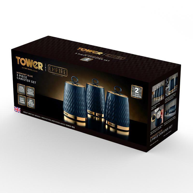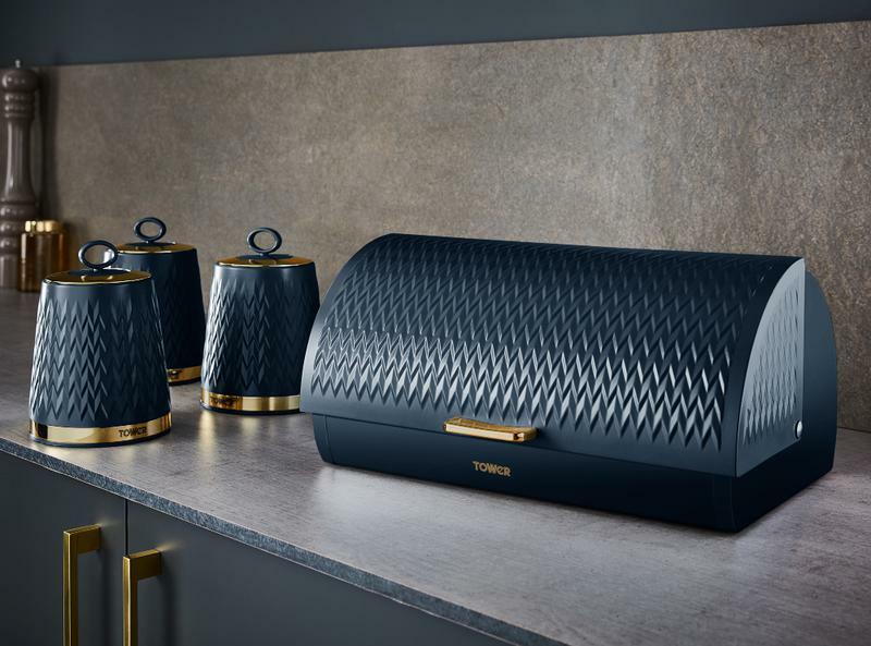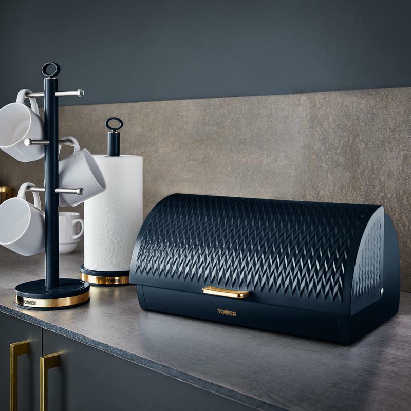 Brand New Tower Empire Storage Set. Stylish & Contemporary Roll Top Bread Bin and Set of 3 Canisters in Midnight Blue with Brass Accents. Ideal Kitchen Storage for Bread, Tea, Coffee & Sugar. UK Stock, Fast Next Day Dispatch & Free Delivery
