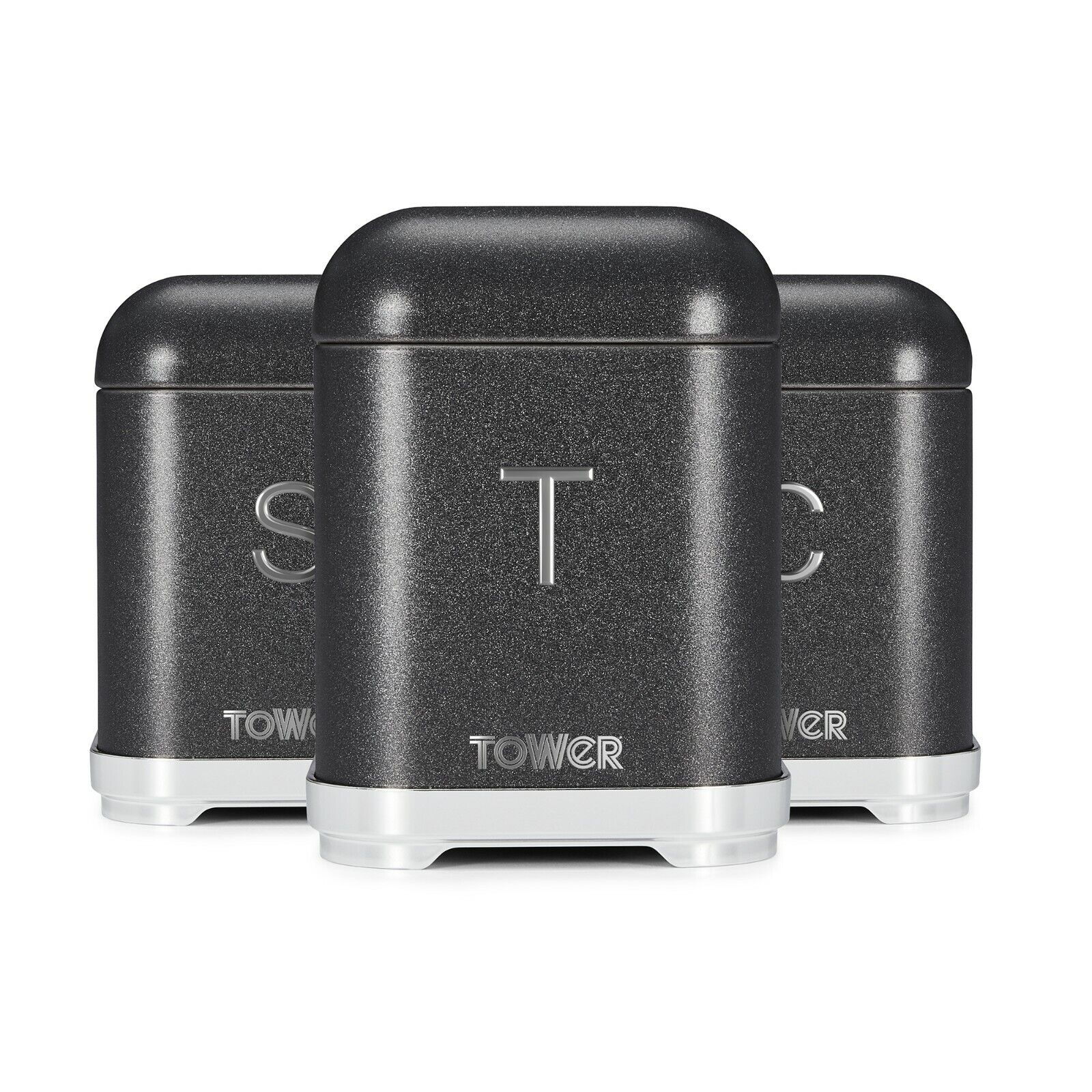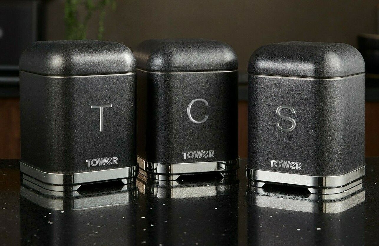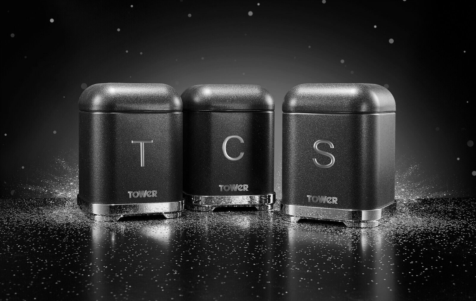 Brand New Tower Glitz Canisters (Tea Coffee, Sugar Storage Set of 3) in Shimmering Black. UK Stock, 2 Year Guarantee. Fast Dispatch & Free Delivery