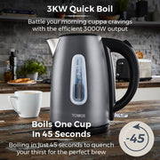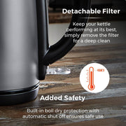 Infinity Stone 3KW 1.7L Jug Kettle Featuring rapid boil technology, you can quickly boil your drinks with the pebble coated design of this stainless steel kettle. Its 1.7 litre capacity packs the ability to make up to 7 cups of water from each boil, with a concealed 3kW heating element with a rapid boiling system that stimulates a faster boil time. The high quality stainless steel body is coated in a slate colour finish to add a splash of colour to the kitchen counter. The removable and washable filter is easy to clean and maintain, while the button flip top lid presents easy of refilling. With a 360 degree swivel base and a rear water window, you can easily gauge the level of water remaining inside.