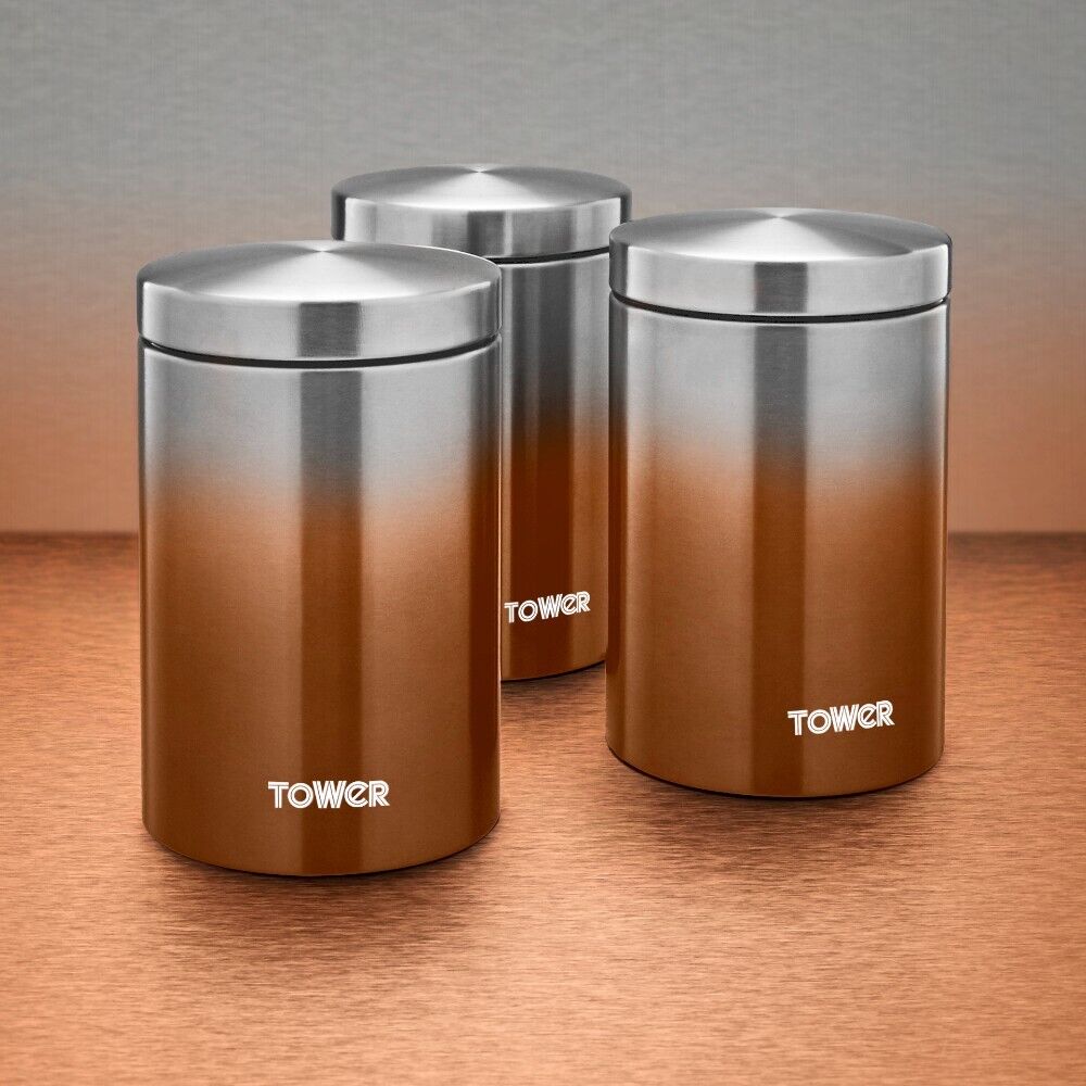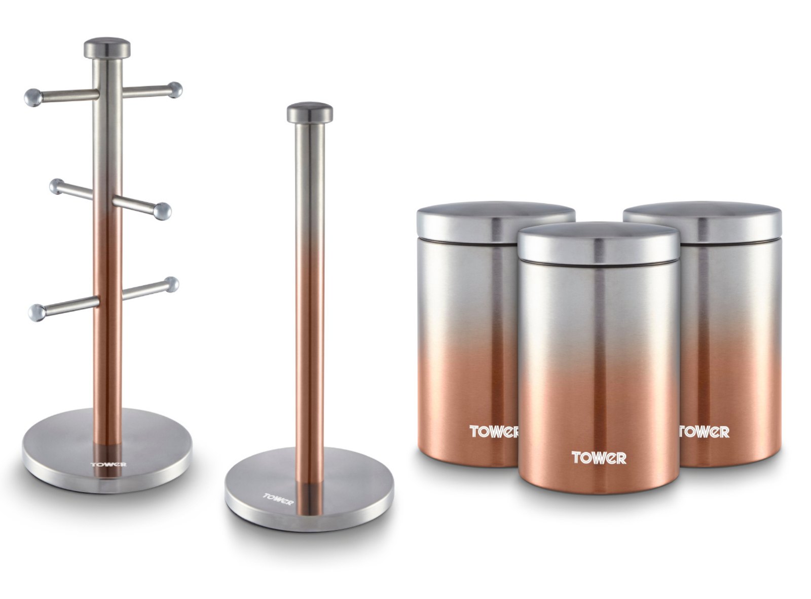 New Tower Infinity Ombre Kitchen Storage Set of 5 including Set of 3 Tea, Coffee & Sugar Canisters, Mug Tree & Towel Pole Matching Set in Copper.