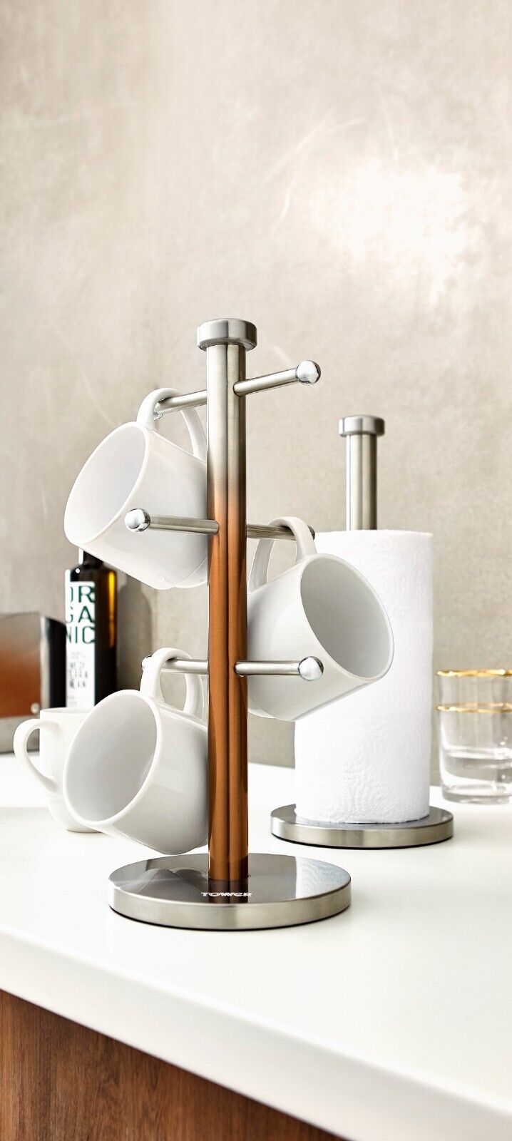 Stylishly display your mugs and keep your kitchen roll in place with the storage set from Tower. The InfinityOmbre set includes a mug tree and towel pole, each constructed from high-quality stainless steel with metallic copper shading to give your surfaces a sleek, clean appearance. The mug tree is adorned with stainless steel hangers for securely holding up to 6 of your favourite cups while saving cupboard space. The narrow towel pole keeps your kitchen roll close to hand for quickly cleaning up spills and messes. Both storage accessories come with a soft, non-scratch underliner to cushion your countertop, while requiring just a simple wipe clean to maintain their polished finish.