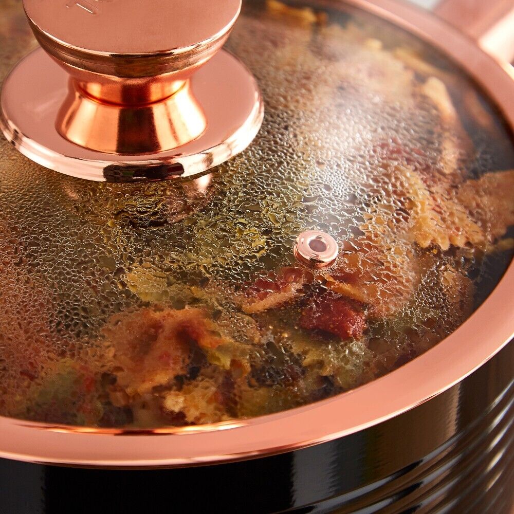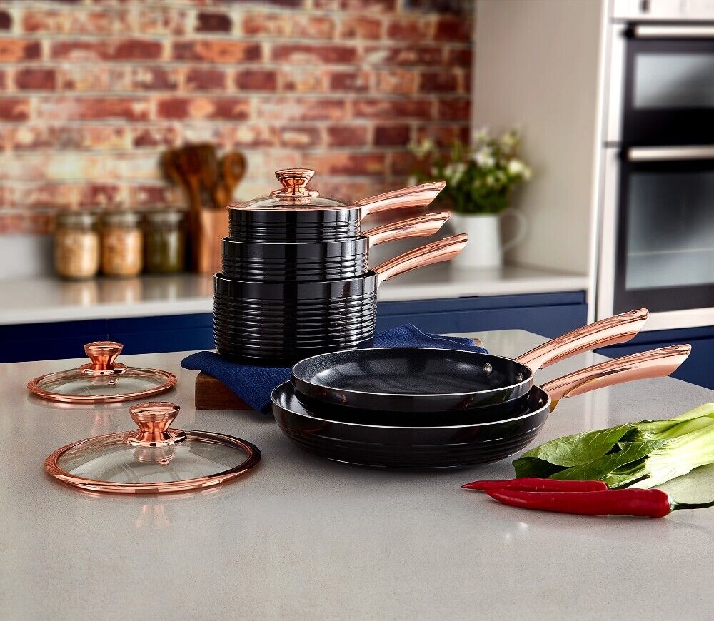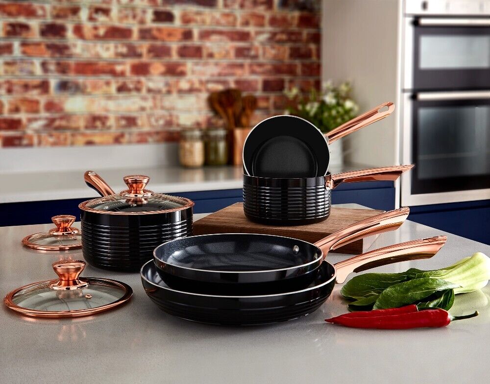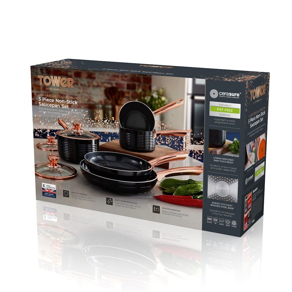 NEW Tower Linear 5 Piece Pan Set in Black & Rose Gold. Brand New UK Stock, Free Delivery. Full 5 Year TOWER Manufacturer Guarantee