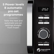 Enjoy straight-forward, no-nonsense cooking using Tower's Renaissance microwave. Powered by intuitive Magnawave technology, heat is evenly distributed ensuring meals are cooked consistently. Conveniently adjust the 5 power settings with a maximum output of 800W to suit the specific cooking job, whether that's warming up a quick meal, thawing frozen meats or softening ice cream. The handy 8 pre-set programmes ensure you get the best results when heating your meals, simply select the chosen pre-set specific to your meal including a defrost function - cook emergency snacks and meals straight from frozen. It's easy to fit a standard sized dinner plate inside with the spacious 20 litre capacity. The glass turntable rotates the food in a circular motion inside the microwave to ensure there are no cold spots