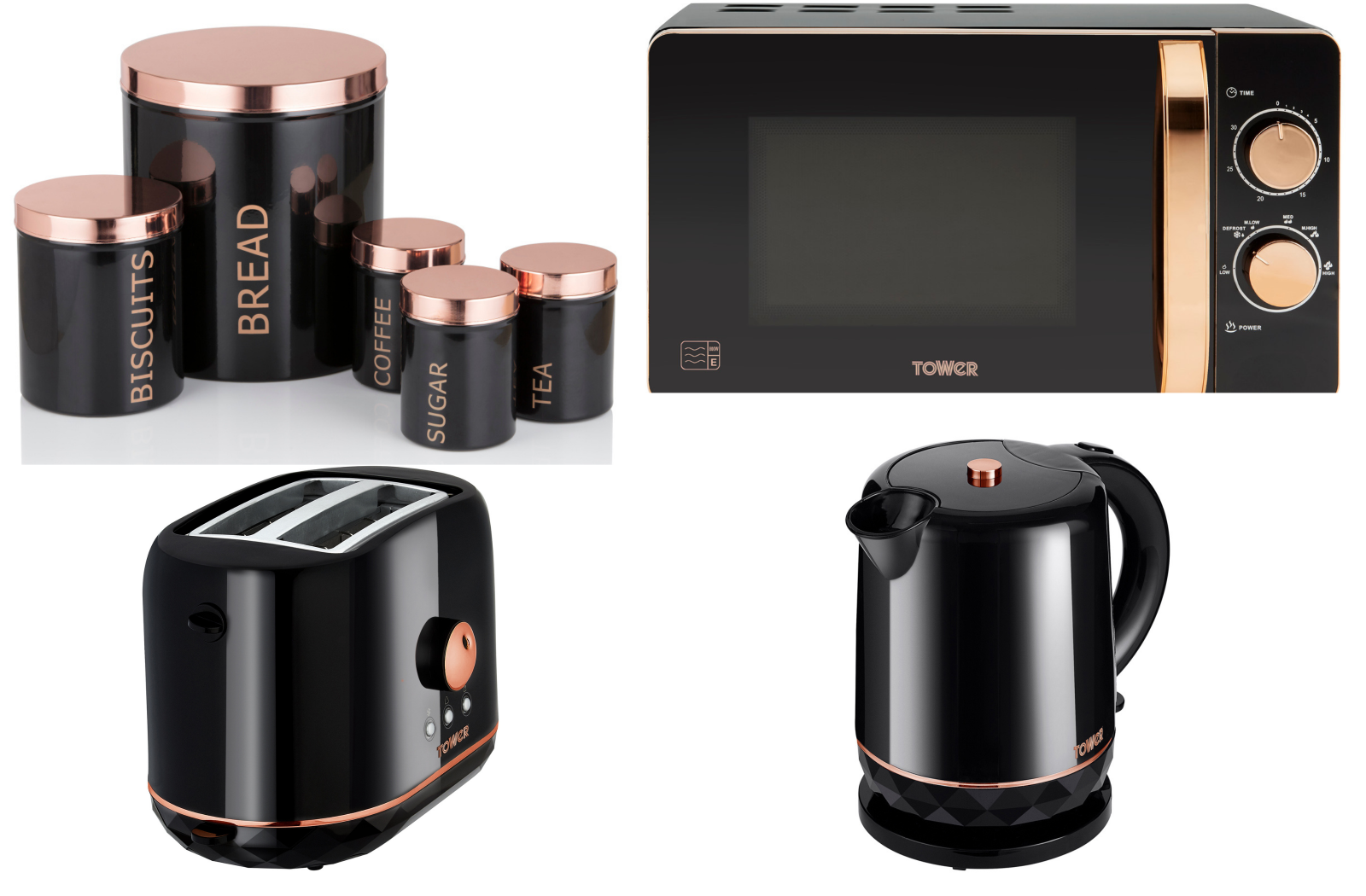 Tower Black & Rose Gold 1.5L Jug Kettle, 2 Slice Toaster, 800W 20L Manual Microwave & 5 Piece Kitchen Storage set including Bread Bin, Tea, Coffee & Sugar Canisters & Biscuit Barrel