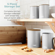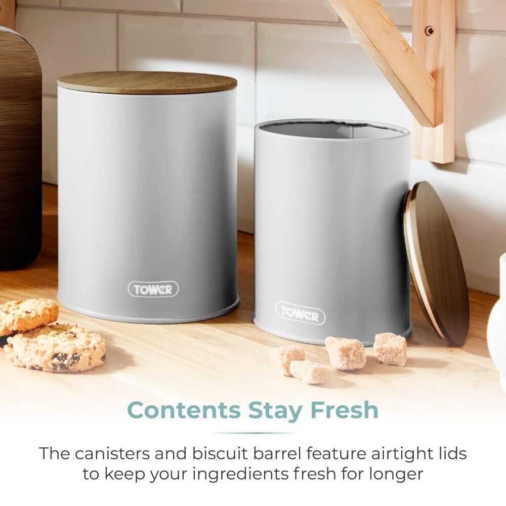 Tower Scandi Dove Grey Bread Bin, 3 Canisters & Biscuit Barrel 5 Piece Kitchen Storage Set