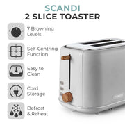 Add a touch of Scandinavia to your kitchen and enjoy breakfast in style with this 2 slice Scandi toaster. Representing the minimalism of Nordic design, this toaster features a neutral and contemporary dove grey colour scheme with wood effect handles, complimenting any kitchen. The wide slots can fit a variety of sized breads, crumpets and muffins with delicious results. It features up to 7 toasting settings and a self-centring function so your toast or muffins will have the texture that's right for you. If you have a loaf in the freezer and need a quick bite to eat, you can toast straight from frozen thanks to the convenient defrost and reheat settings. Comes with 3 years warranty