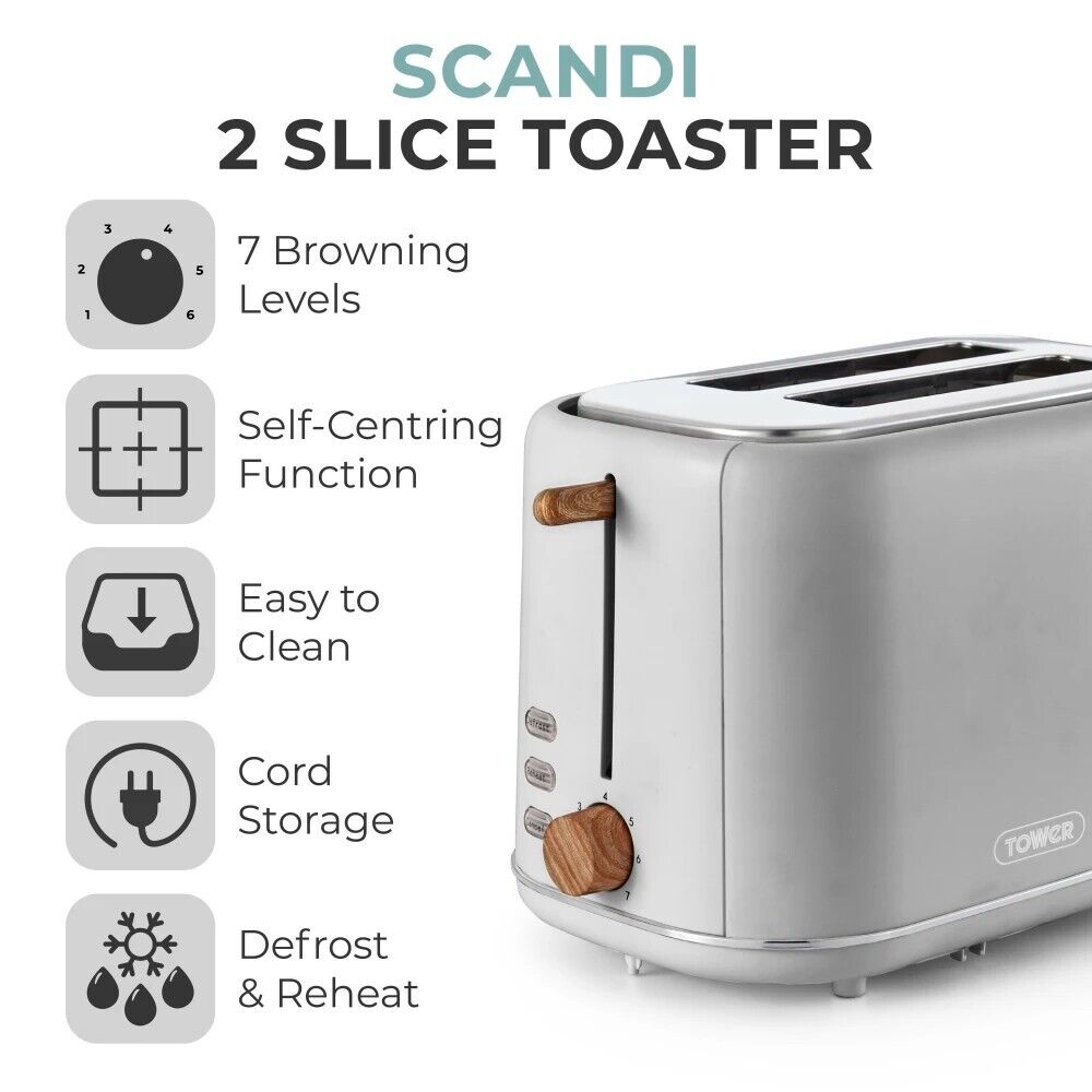 Tower Scandi 3KW 1.7L Kettle & 2 Slice Toaster in Dove Grey with Wooden Accents. Contemporary Matching Kettle & Toaster Set