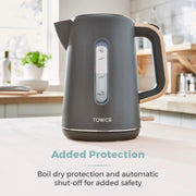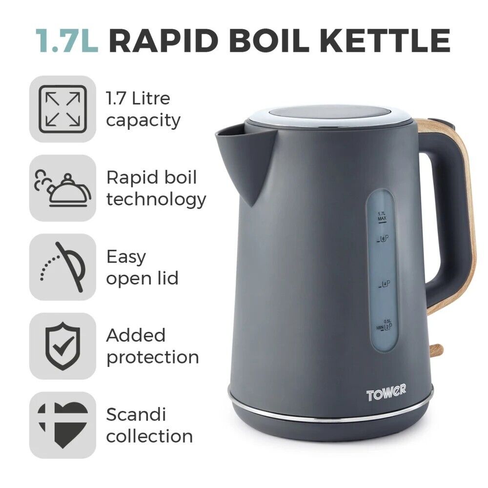 Enjoy a tasty brew with this Tower Scandi 3.kW cordless kettle. The 1.7L capacity lets you make up to 7 cups of tea or coffee from a single boil, perfect for playing host to family and friends. With rapid boil technology, the kettle boils in minutes so you can enjoy your beverage in no time. Featuring a design inspired by Scandinavian minimalism, this kettle has a subtle grey coating with wood effect accents, which fits perfectly in a range of kitchen decors. Includes a push button lid, making it easy to refill, while the integrated cord storage keeps your kitchen countertop looking tidy. Automatic shut-off and boil dry protection provides added safety once the kettle has boiled. This Scandi kettle comes with Tower's standard 1 year warranty, with an additional 2 years when you register the product online. That's a total of 3 years peace of mind in the event of fault.