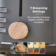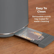 Add a touch of Scandinavia to your kitchen and enjoy breakfast in style with this 2 slice Scandi toaster. Representing the minimalism of Nordic design, this toaster features a neutral and contemporary grey colour scheme with wood effect handles, complimenting any kitchen. The wide slots can fit a variety of sized breads, crumpets and muffins with delicious results. It features up to 7 toasting settings and a self-centring function so your toast or muffins will have the texture that's right for you. If you have a loaf in the freezer and need a quick bite to eat, you can toast straight from frozen thanks to the convenient defrost and reheat settings. Comes with 3 years warranty.