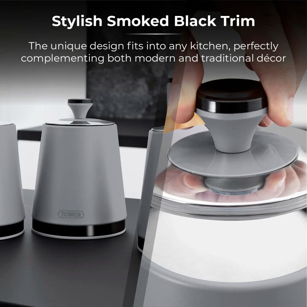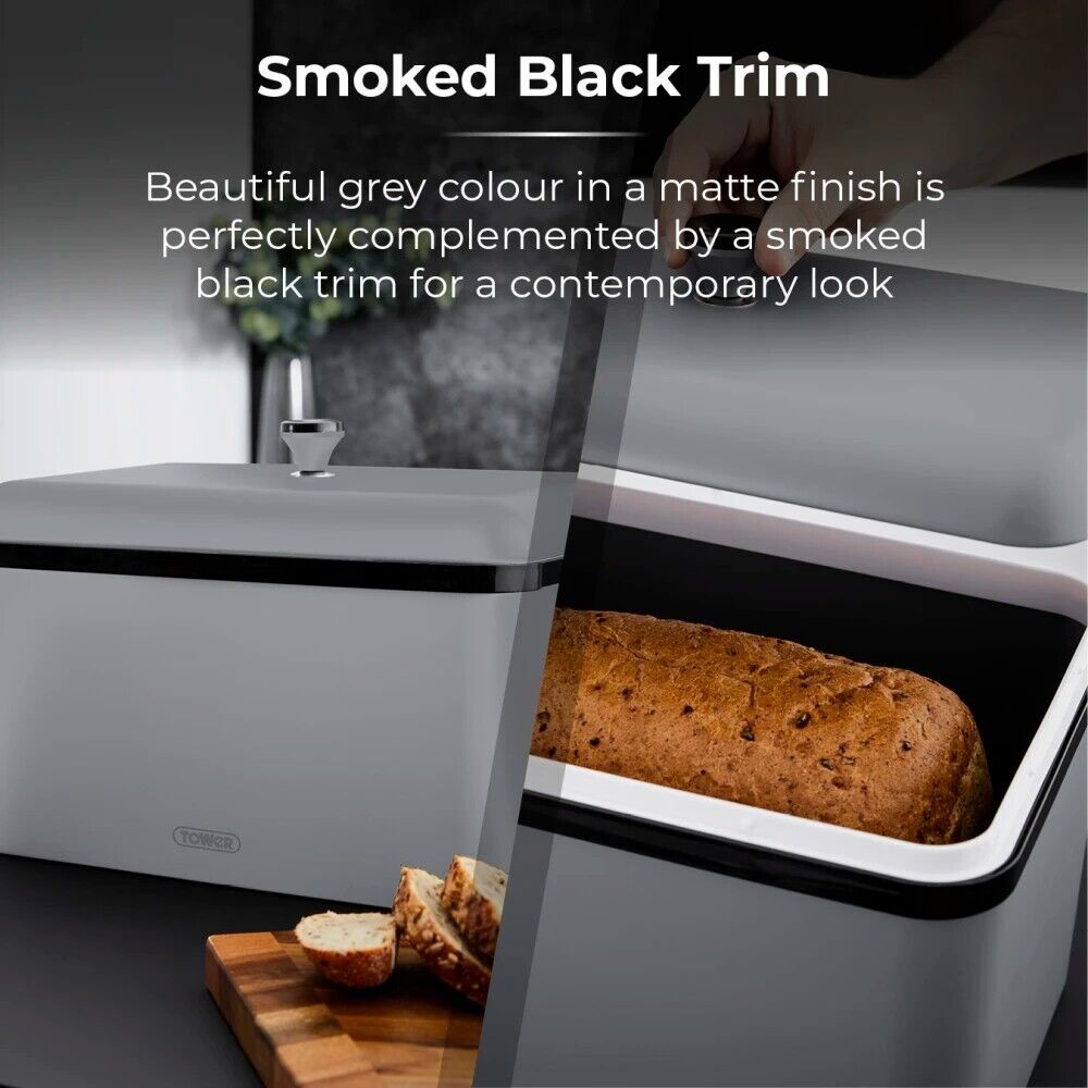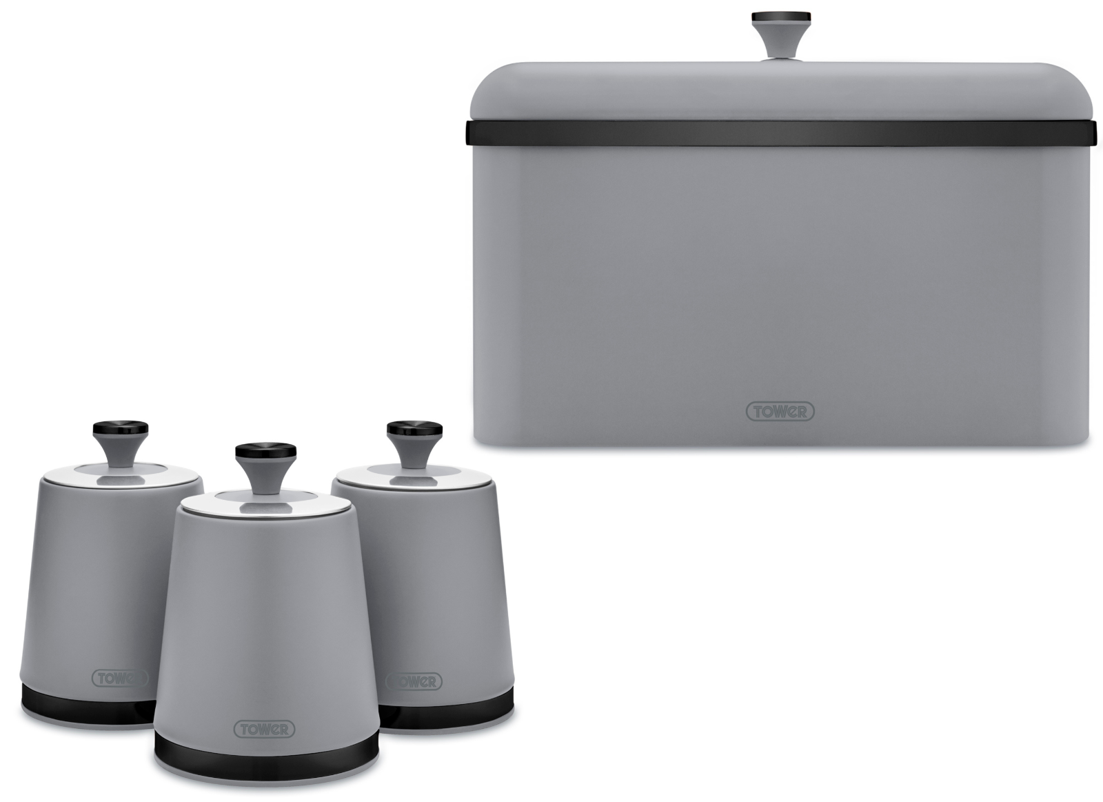 Tower Sera Grey Breadbin & Tea, Coffee, Sugar Canisters. Contemporary Matching Kitchen Storage Set in Grey with Black Smoked Trim