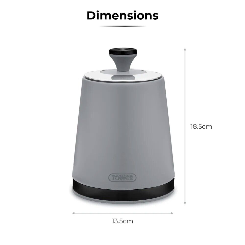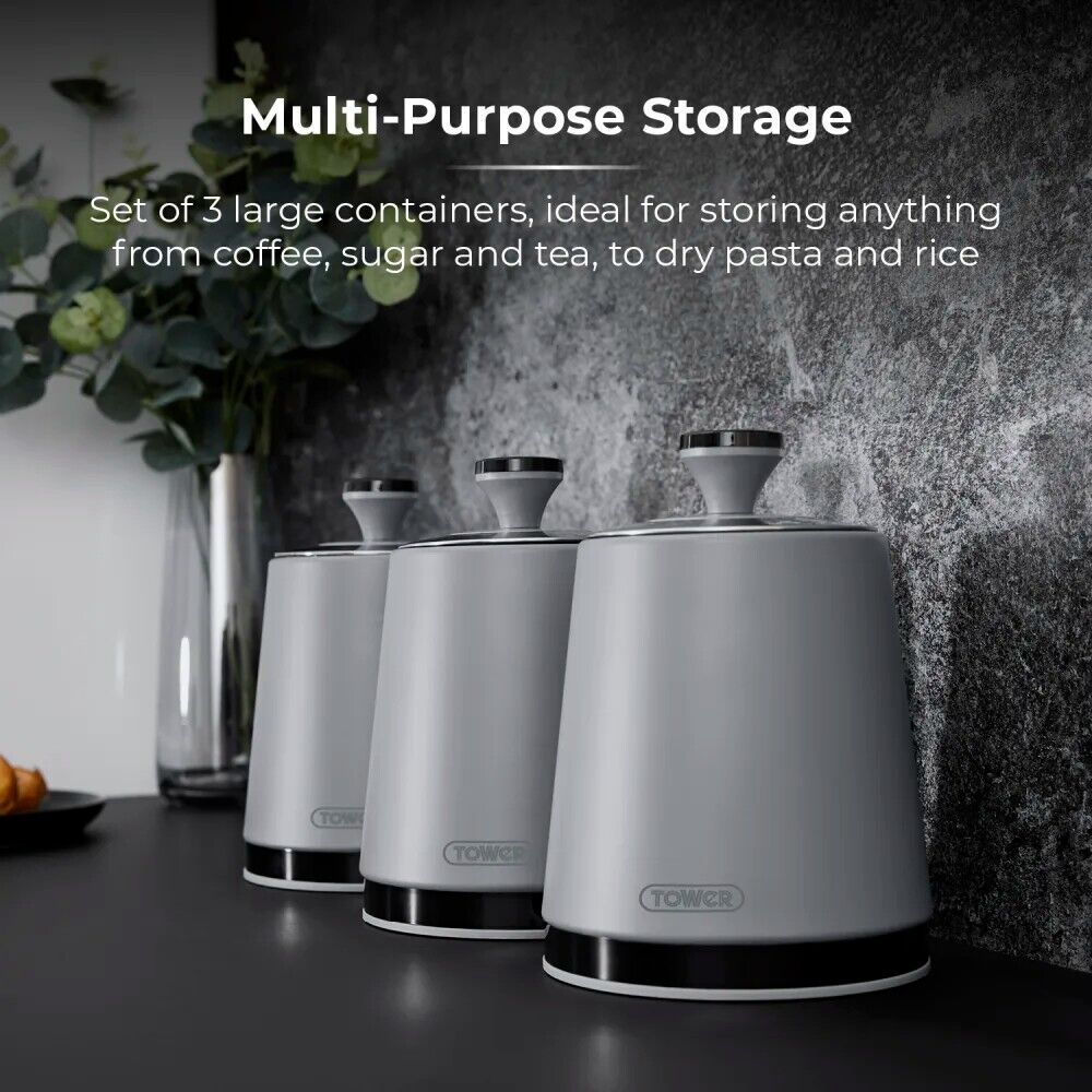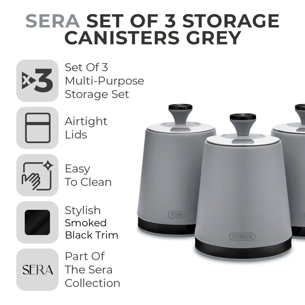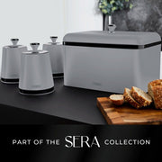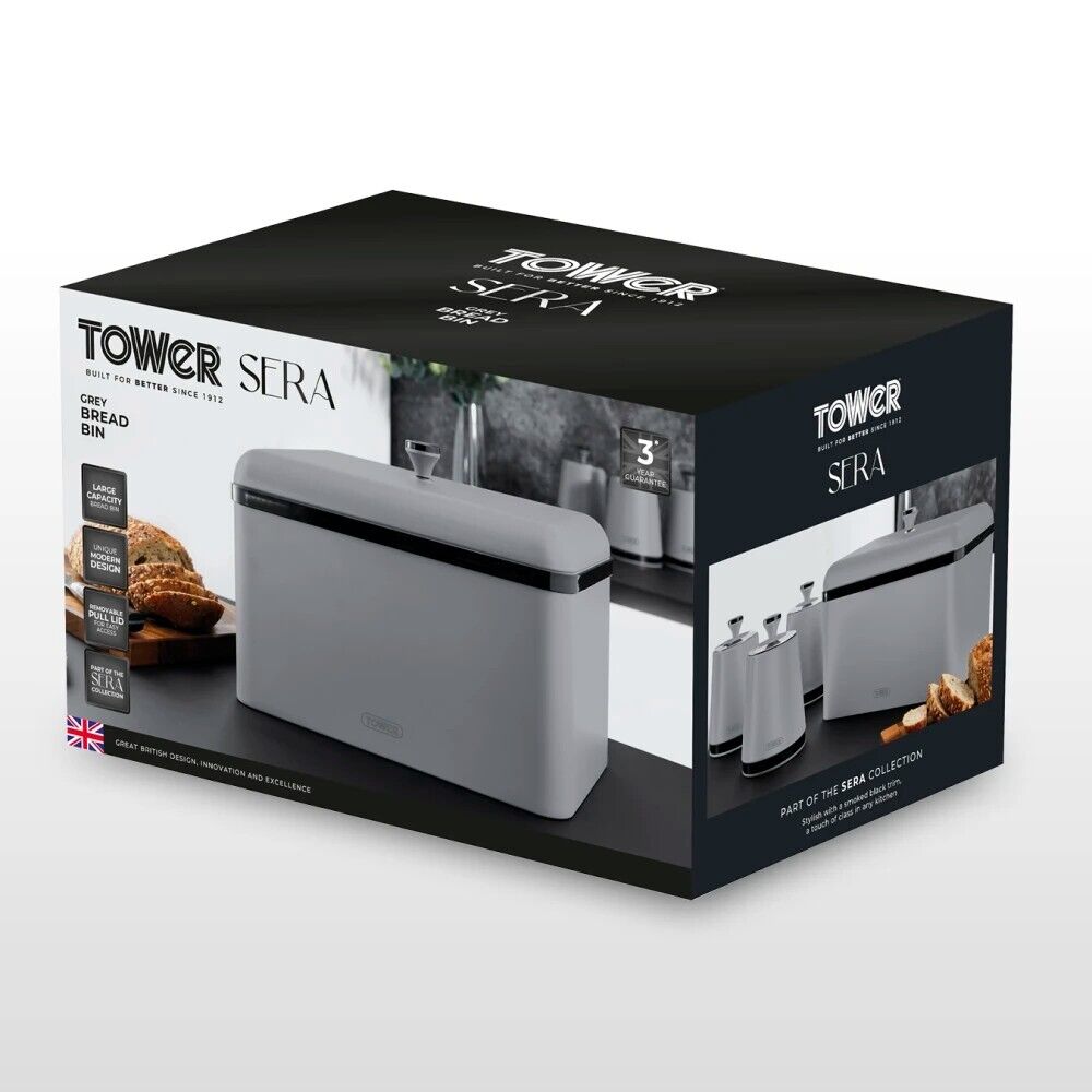 Tower Sera Grey Breadbin & Tea, Coffee, Sugar Canisters. Contemporary Matching Kitchen Storage Set in Grey with Black Smoked Trim