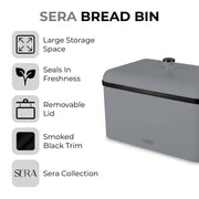 This beautiful bread bin from Sera is perfect for keeping your favourite baked good fresh for longer. The stylish matte grey finish with smoked black trim adds a sleek feel to any modern kitchen and perfectly complements any contemporary and traditional decor. The lid is fully removable for easy access and completely airtight for long lasting freshness. The compact design and large inner capacity ensures it takes up minimal space on the countertop, whilst a simple wipe clean is all that is required to keep the bread bin in pristine condition.