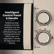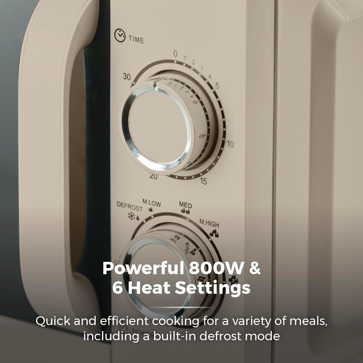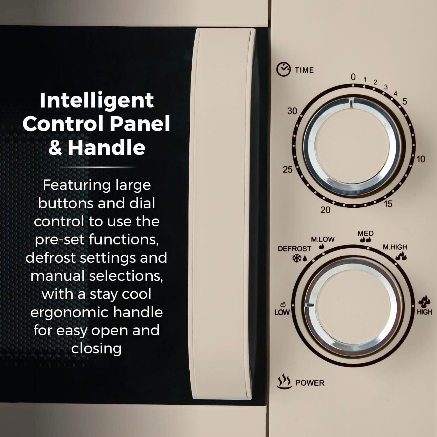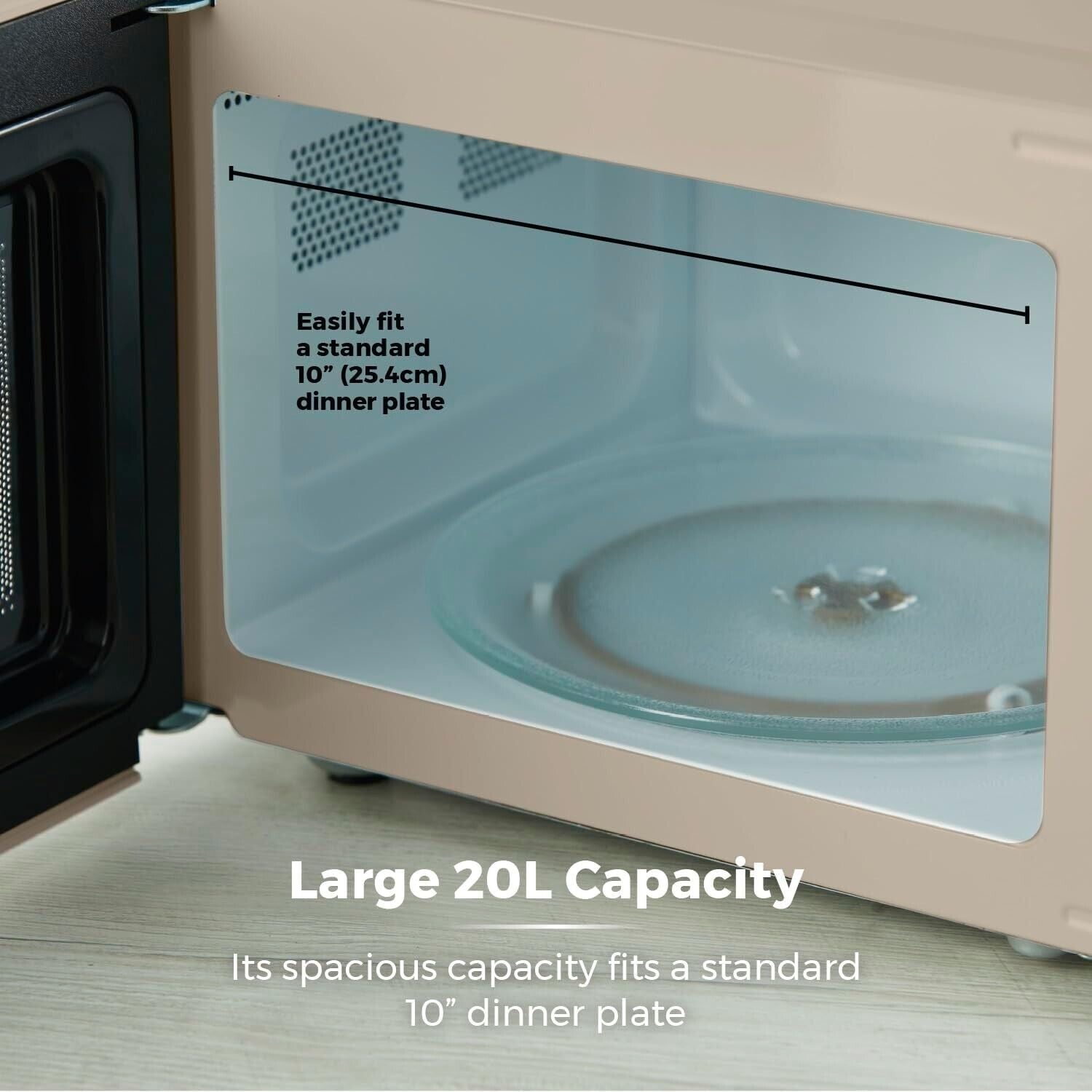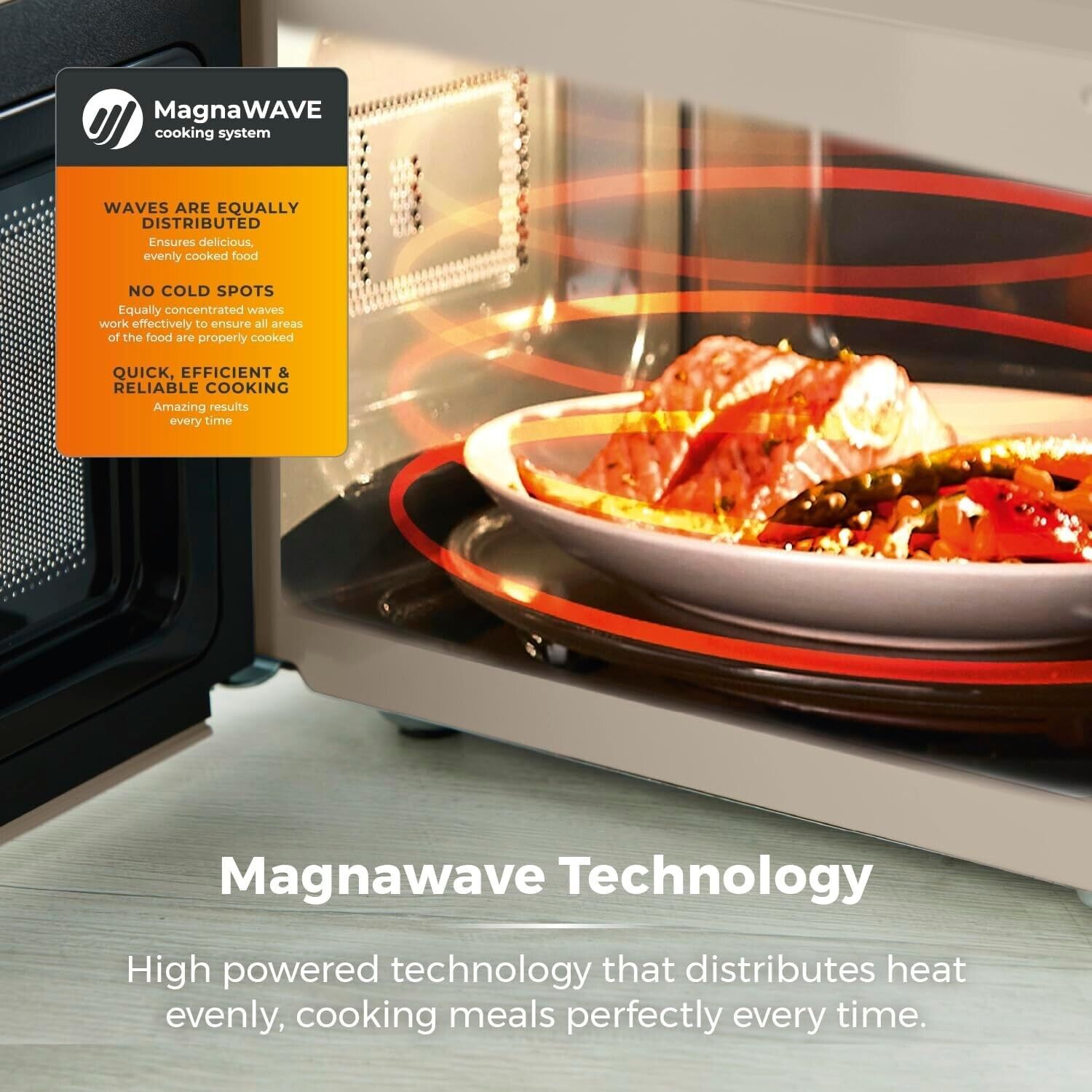 Powered by MagnaWave technology, concentrated waves circulate to ensure heat is distributed evenly for a well cooked meal - keeping intense flavours for amazing results. This microwave features a powerful 800W output for faster cooking heating, with 6 adjustable heat settings. The huge inner 20 litre capacity can easily fit a standard 10 dinner plate, giving you versatility to use large dishes to cook for the whole family. Its 30-minute timer provides enough time to cook meals with complete precision, whilst the defrost function cooks meals from frozen in minutes - ideal for leftovers or a speedy emergency snack. The intelligent control panel features large buttons dial control to use the pre-set functions, defrost settings manual selections, with a stay cool ergonomic handle for easy open closing. A high quality glass turntable ensures your food is cooked thoroughly, while its sleek mirror door looks great in modern kitchens. The easy clean interior requires a simple wipe after use.