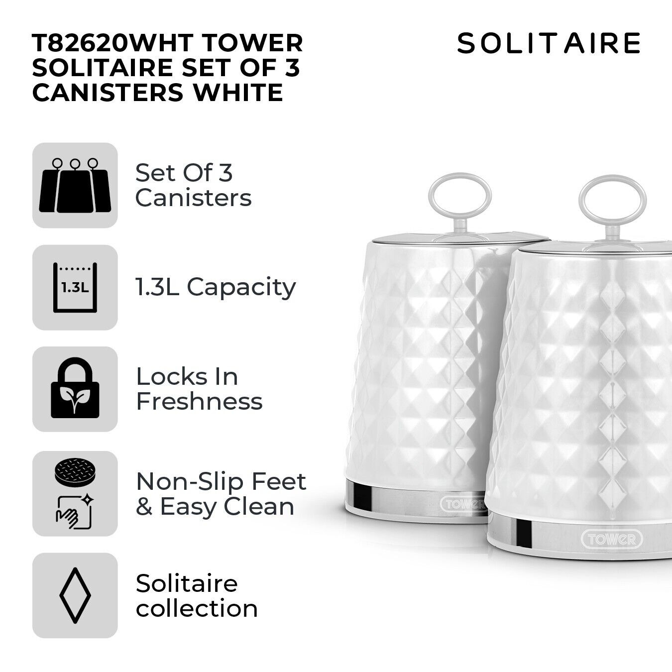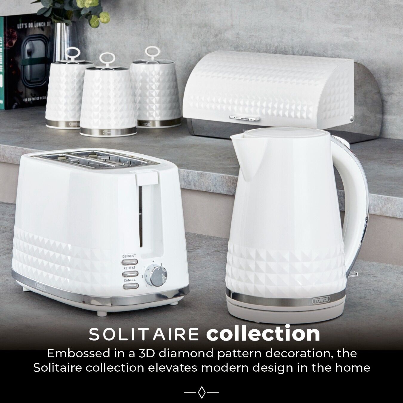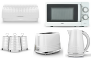 Brand New Tower Solitaire 3KW1.5L Kettle, 2 Slice Toaster, T24042WHT 800W 20L Manual Microwave, Bread Bin & Canisters Contemporary Matching Kitchen Set in White. Fast Dispatch, Free Next Working Day Delivery. Tower 3 Year Manufacturer Guarantee
