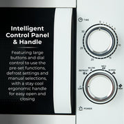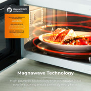 Powered by MagnaWave technology, concentrated waves circulate to ensure heat is distributed evenly for a well cooked meal - keeping intense flavours for amazing results. This microwave features a powerful 800W output for faster cooking heating, with 6 adjustable heat settings. The huge inner 20 litre capacity can easily fit a standard 10 dinner plate, giving you versatility to use large dishes to cook for the whole family. Its 30-minute timer provides enough time to cook meals with complete precision, whilst the defrost function cooks meals from frozen in minutes - ideal for leftovers or a speedy emergency snack. The intelligent control panel features large buttons dial control to use the pre-set functions, defrost settings manual selections, with a stay cool ergonomic handle for easy open closing. A high quality glass turntable ensures your food is cooked thoroughly, while its sleek mirror door looks great in modern kitchens. The easy clean interior requires a simple wipe after use