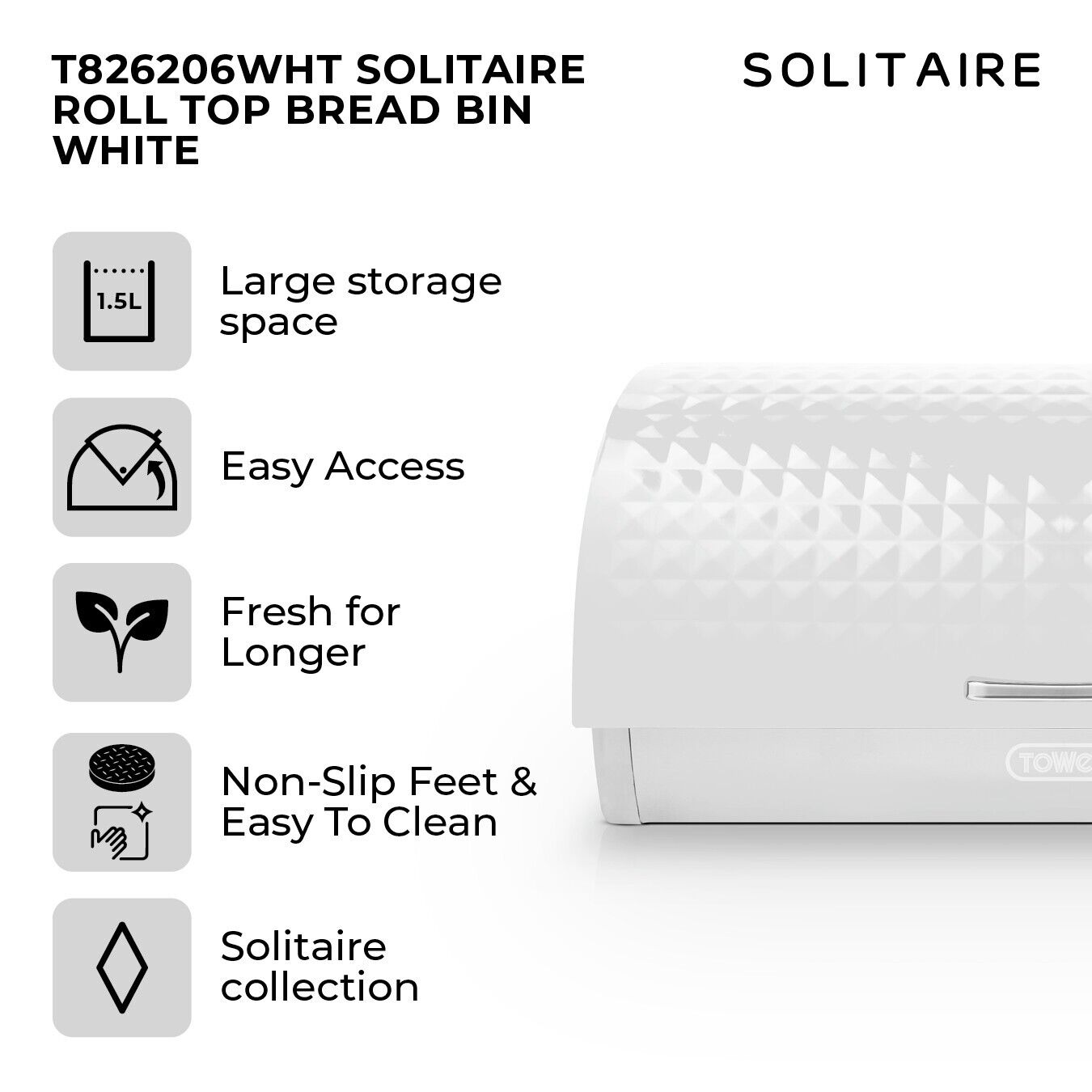 Tower's Solitaire bread bin provides premium storage for your fresh baked goods. Its stainless steel design coated in a sleek white colour give your countertop a touch of contemporary appeal. The built-in ventilation system traps moisture to prevent goods from drying out, preserving their fresh texture and taste for longer. A large inner capacity provides enough room to store bread loaves, crumpets and bagels of varying sizes, complete with roll top lid and bar handle to easily access held contents. Its durable stainless steel body requires just a simple wipe down to maintain the pristine finish.