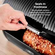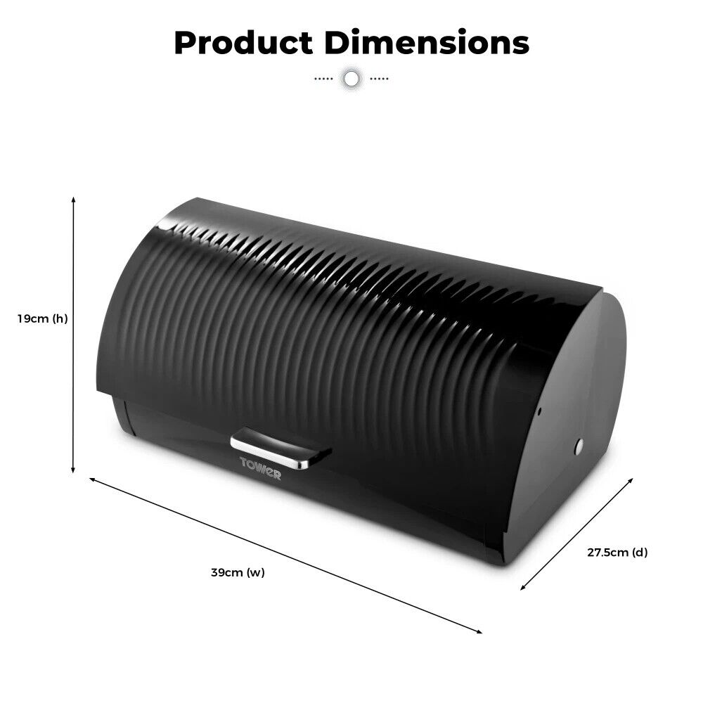 Tower’s Sonar bread bin provides a premium storage solution for your fresh baked goods. Featuring a black coated iron body that adds a sleek look to your worktop for contemporary appeal, the bread bin looks at home in modern and traditional kitchens. The built-in ventilation system traps moisture to prevent goods from drying out, preserving their fresh texture and taste for longer. A large inner capacity provides enough room to store bread loaves, crumpets and bagels of varying sizes, complete with roll top lid and bar handle to easily access held contents. Its durable body requires just a simple wipe down to maintain the pristine finish.