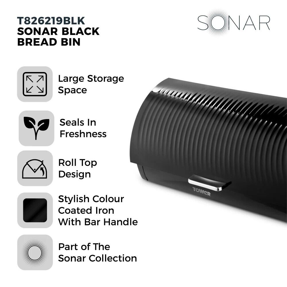Tower Sonar Black Bread Bin Kitchen Storage. Part of The Sonar Collection, Embossed with a beautiful ripple design, Sonar brings a layer of texture to the home for a unique, high class look.
