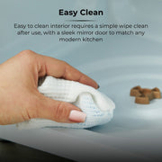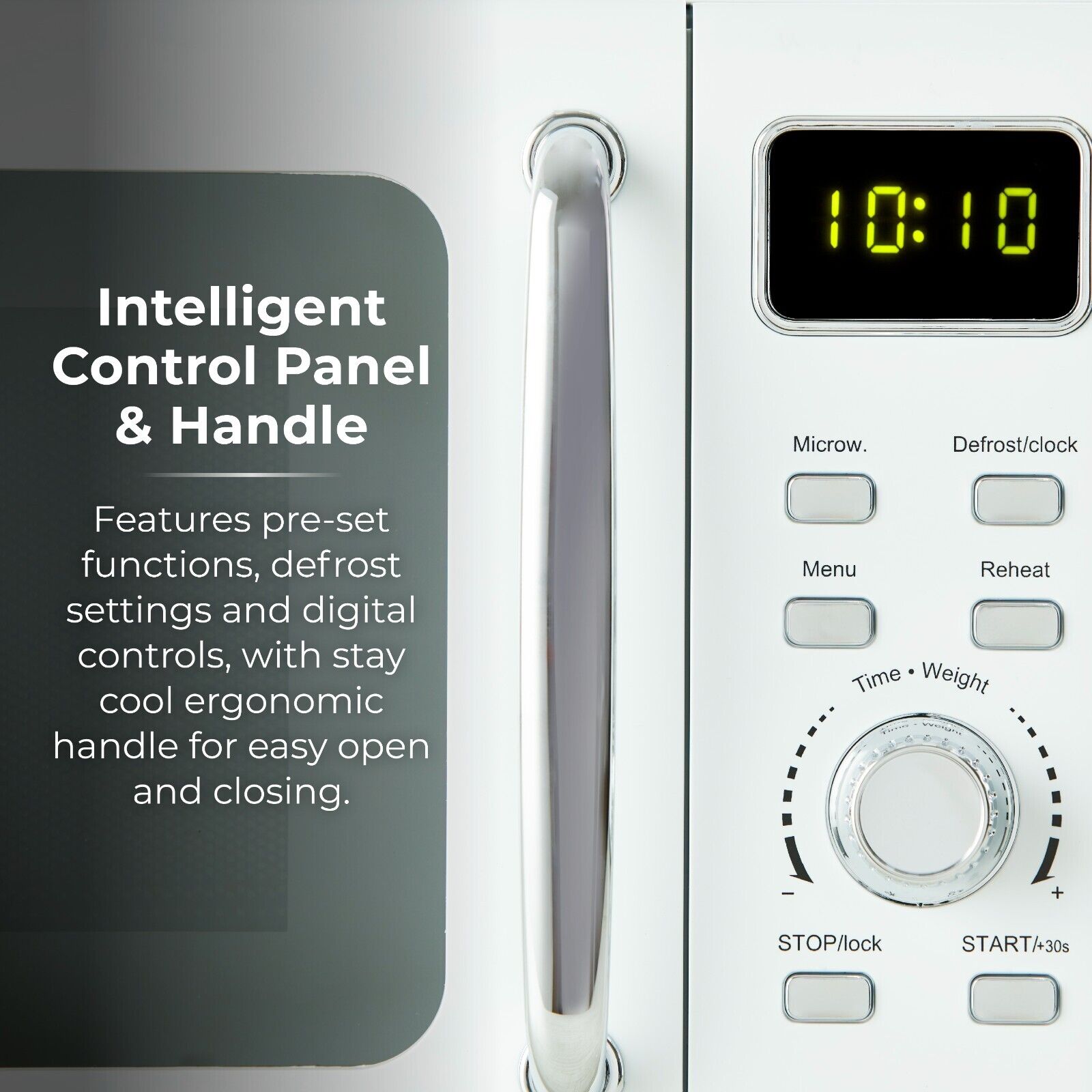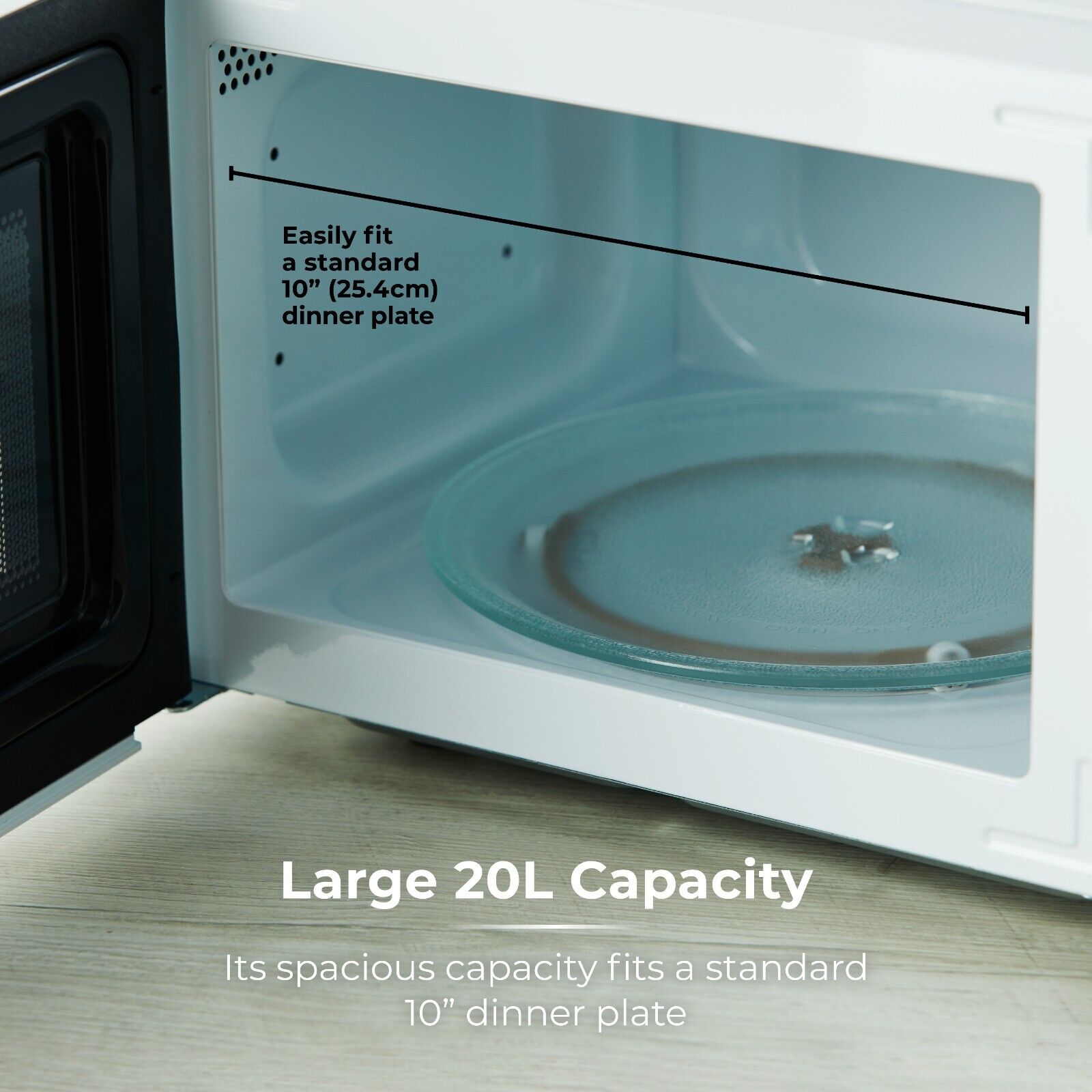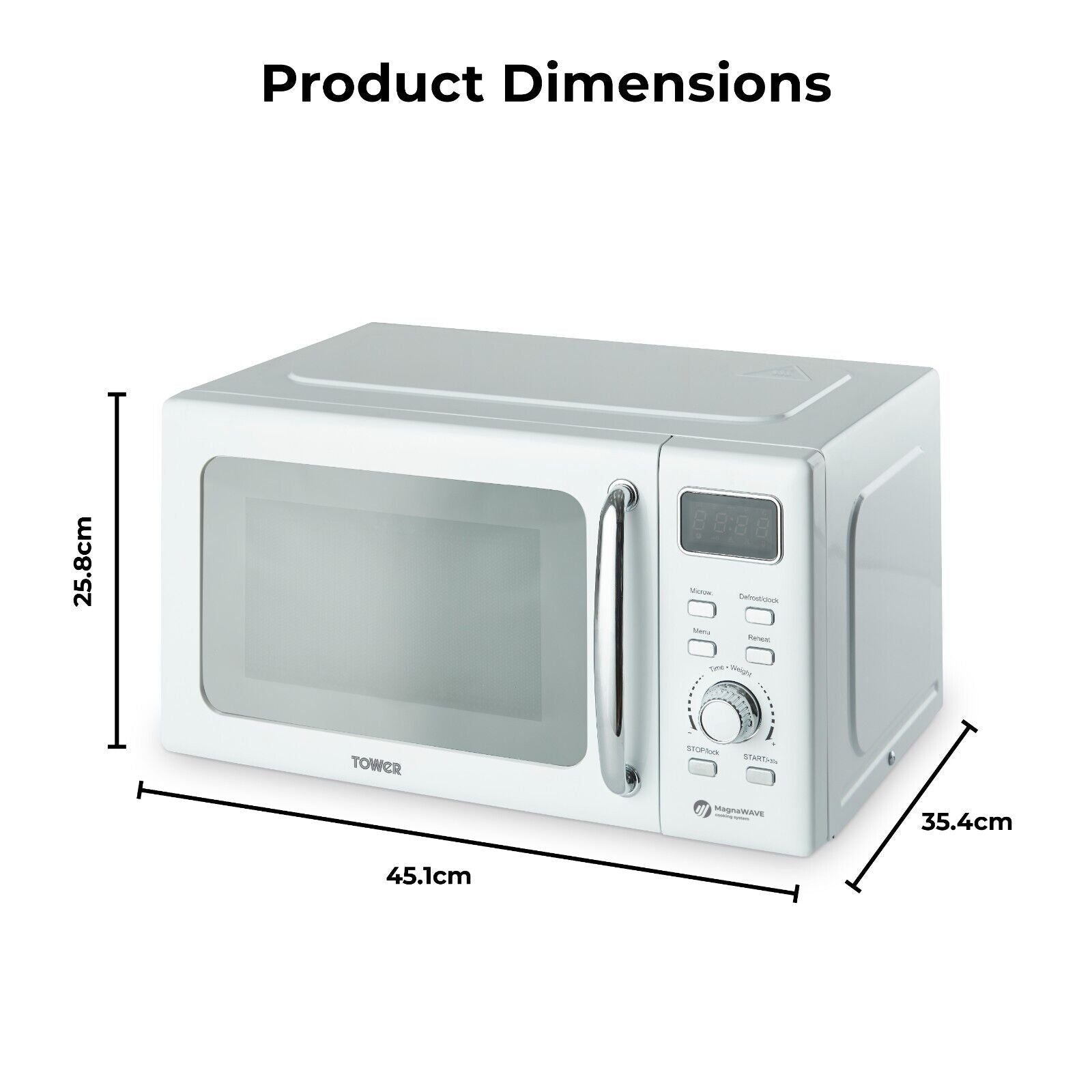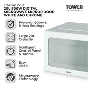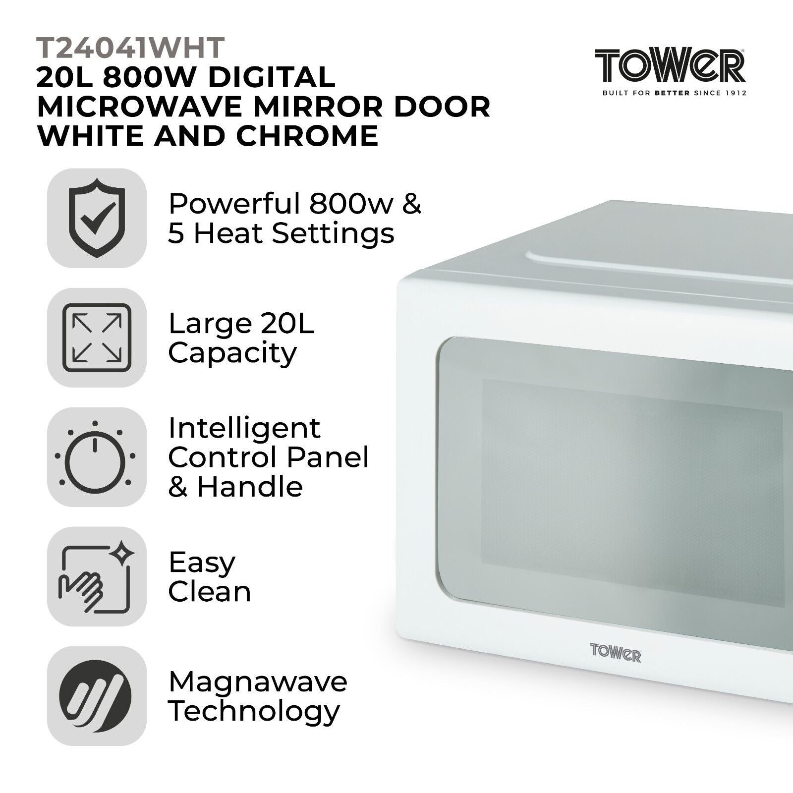 Powered by MagnaWave technology, concentrated waves circulate to ensure heat is distributed evenly for a well cooked meal - keeping intense flavours for amazing results. This microwave features a powerful 800W output for faster cooking with 5 adjustable heat settings. A huge inner 20L capacity easily fits a standard 10 dinner plate letting you cook for the whole family a 60-minute timer provides enough time to cook meals with precision. The defrost function cooks meals from frozen in minutes. 8 cooking pre-sets add variety to meal times with choices including potato, pasta, pizza, popcorn, vegetable, beverage, meat fish. The intelligent control panel features large buttons dial control to use the pre-sets, defrost settings manual selections, with a stay cool ergonomic handle for easy open closing. A high quality glass turntable ensures food is cooked thoroughly for delicious results, while a sleek mirror door looks great in modern kitchens the easy clean interior requires a simple wipe after use.
