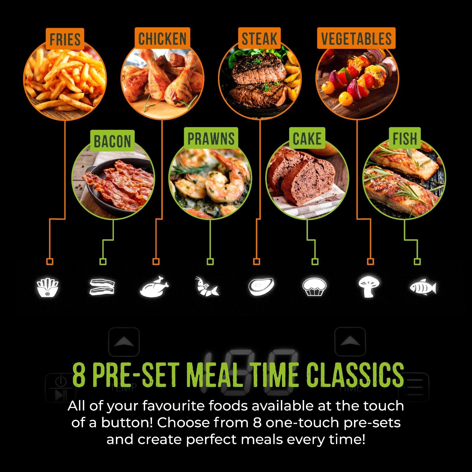 Pre-sets: Fries. Bacon. Drumsticks.